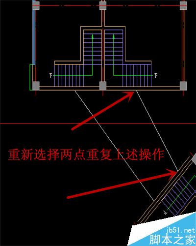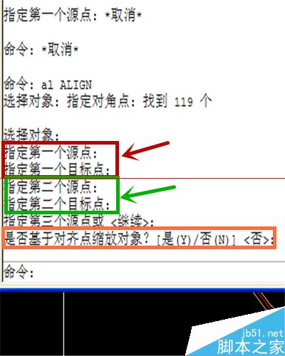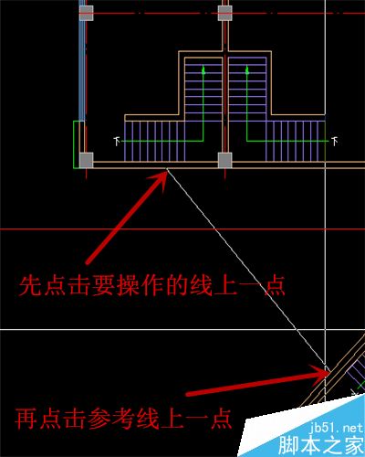 6、再根據上圖中命令行的綠色框中提示進行操作,同樣是先點擊要操作圖形線上的一點,再點擊參考線上的一點。