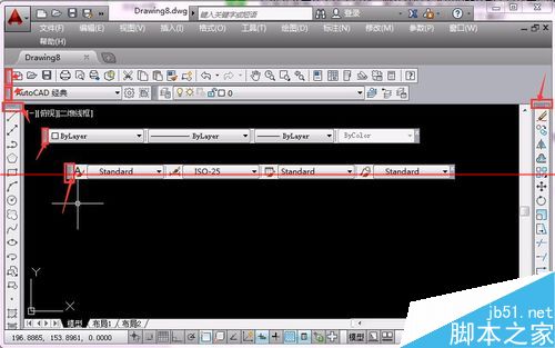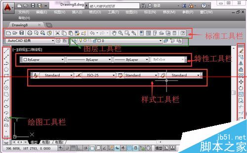2、標準菜單有幾十種工具欄,默認情況下會出現的頂部工具欄有標準工具欄,樣式工具欄,特性工具欄,兩側有繪圖工具欄及修改工具欄