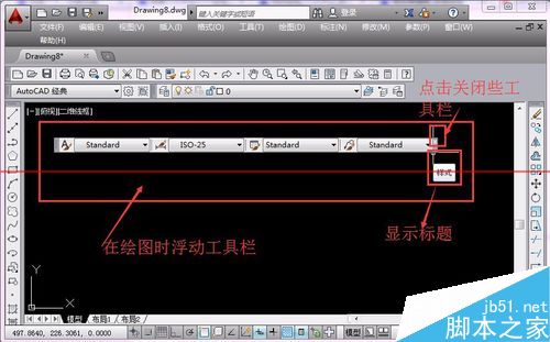 6、工具欄可以從固定工具欄中拖拽到繪圖區,此時為浮動工具欄,顯示此工具欄的標題,點擊小叉子可以關閉該工具欄