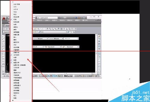 4、就會彈出工具欄的標簽列表,把常用的工具欄打上對勾,即直接點擊標簽名,自動在工作界面打開該工具欄,再點就關閉工具欄,用鼠標隨便點一下編輯區域,工具欄標簽列表關閉