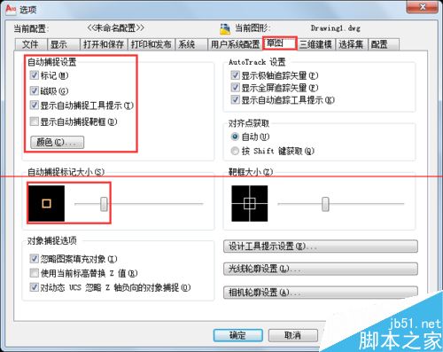 3、在命令行輸入op(命令全名preferences),打開“選項”對話框,在“草圖”選項卡里的自動捕捉設(shè)置中,基本保持CAD初始默認(rèn)的設(shè)置即可。在這里可以將捕捉框用鼠標(biāo)拉大一些,初始值默認(rèn)為3太小,也可以用命令aperture直接設(shè)置捕捉框的大小為5~8,不要設(shè)置得太大,避免在實體密集處不好選點。