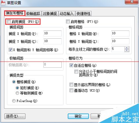 2、在“捕捉和柵格”選項卡內(nèi),取消對“啟用捕捉”的勾選,可以避免在看不到柵格時(旁邊“啟用柵格”已經(jīng)關(guān)閉)而鼠標(biāo)卻總是跳過并移動不到你想要去的地方的情況。