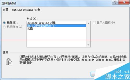 3、將圖形復制到打開的Excel表格中,單擊右鍵出現選擇對話框,選擇“選擇性粘貼"這一選項。并出現一個對話框,對話框中有三個選擇,選擇第二項,”圖片(增強型圖元文件)”,得到一個圖像。