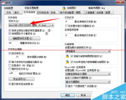 7、在彈出的下拉菜單中選擇你想要選擇的文件版本,此處設(shè)為cad2007為例,