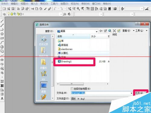 2、在打開的軟件中點擊“文件”選擇“打開”找到自己要定義成塊的圖形,如圖所示。