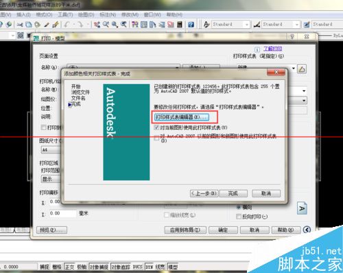 6.此時可點擊完成,就創立了新的打印樣式表,如果需修改線寬,可后面再修改,也可現在就點擊“打印樣式表編輯器”。