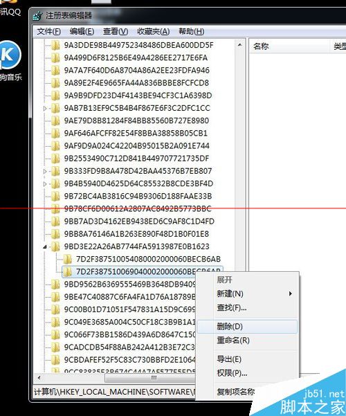 1、我們知道,主要就是要刪除7D2F開頭的鍵值,但是有時候找不到這些鍵值在哪,或者說不知道有沒有找全,還有一種是找到了卻拒絕訪問,無法刪除。(注意:注冊表的刪除有風險,請記得提前備份,防止勿刪。)