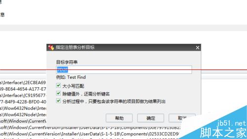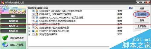 2、先說說找不到或者不知道有沒有找全這種情況。這里我利用的是優化大師的注冊信息清理里面的查找目標這個功能,其實也可以直接用注冊表自帶的搜索功能,但是它只能找完一個再進行下一個搜索。這里我們在目標字符串框填“7D2F”,把下面 大小寫匹配等三個框框都勾選,然后點擊確定進行搜索。