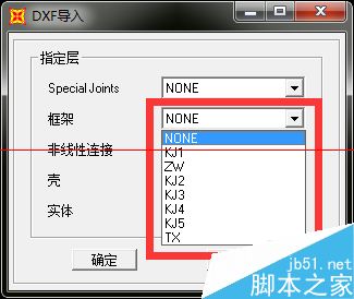6、接著會出現“DXF導入”對話框,可以指定需要導入的圖層,建議分層導入,然后分別定義材料(注意每次導入的方向都應該相同,在本例中均為Z方向,否則結構最終不會形成整體)