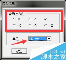 5、雙擊需要導入的文件后會彈出“導入信息”對話框,需要選擇全局方向和單位,以上述圖形為例,以為鐵塔的延伸方向是沿Z軸向上的,所以勾線Z,單位以建筑的一般表示方法為準,采用毫米mm、千牛KN、攝氏度℃,設置完后點擊“確定”