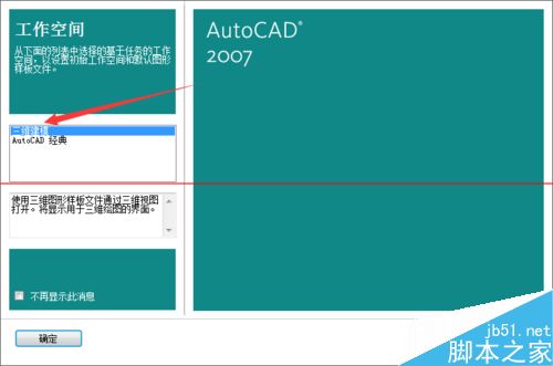 打開CAD,在進入界面選擇“三維建模”點擊“確定”,進入三維建模操作界面