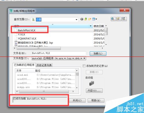 3、在彈出的窗口中選擇剛剛下載的文件路徑,選擇Batchplot文件,下面會提示加載成功;