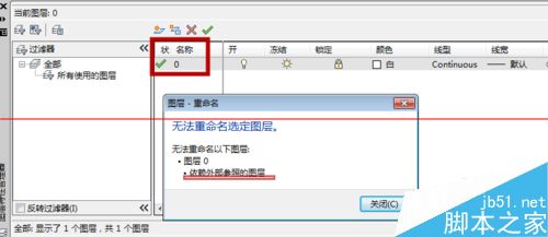 3、里面有一個cad默認的圖層,我們是沒有辦法修改的,大家可以自己試下,雙擊修改它的名稱,它會提示這個是我們”依賴外部參照的圖層“