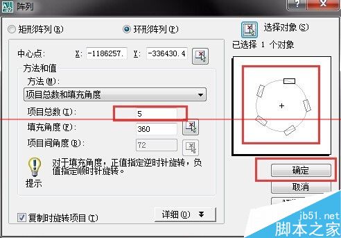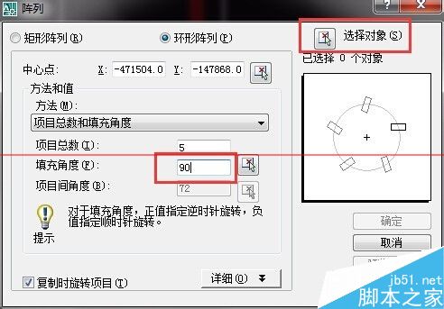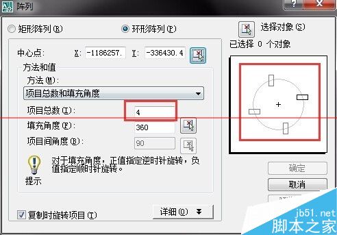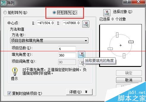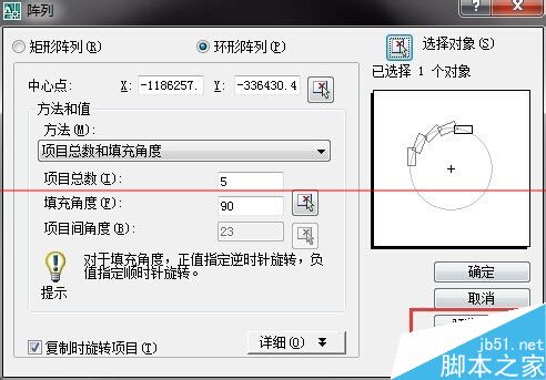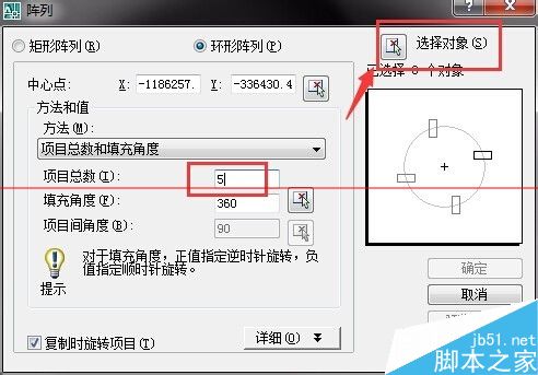 4、之后調節項目數,項目數就是你要陣列多少條紅色的線條,右邊有預覽(一般預覽是在選擇完對象之后才能看到),可以看到陣列的方向,之后選擇對象,如圖所示