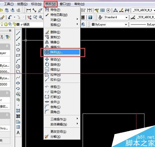 2、首先調出來陣列的命令,修改——陣列(或者是快捷鍵ar),如圖所示