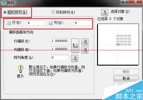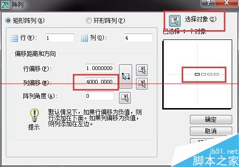 3、因為小編畫的是豎線,所以說小編陣列列,在行里面天上1即可,在列里面填上你要陣列的列數,比如說小編陣列的4列,填上四列,還有陣列的間距,然后點擊選擇對象,如圖所示