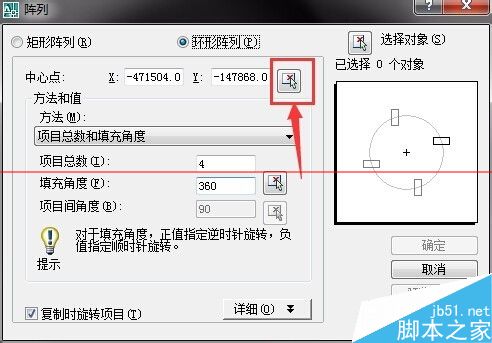 3、之后選擇陣列中心點,一般都選擇圓形的中心,如圖所示