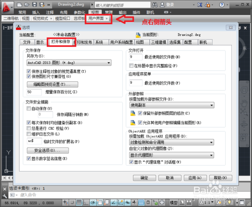 點擊“用戶界面”右側箭頭,即會彈出選項對話框。在彈出的對話框中選擇“打開和保存”