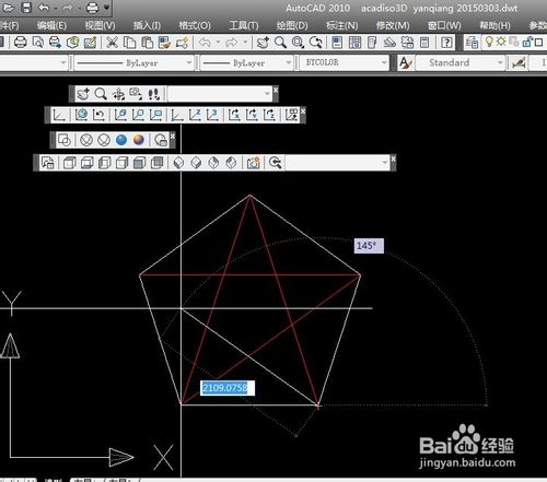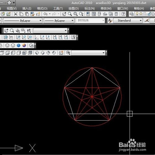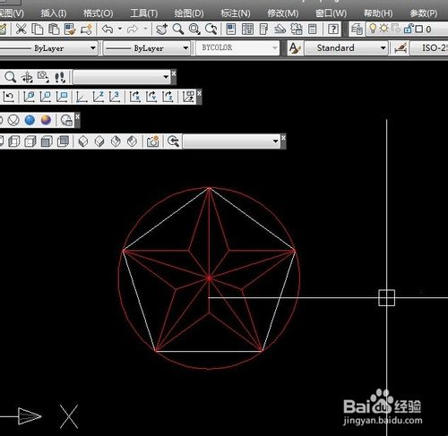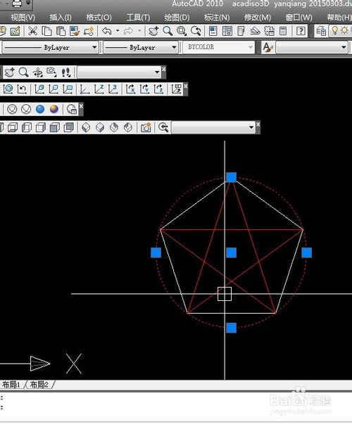 繪制正五邊形,并連接各頂點,得五角星二維。然后圓的3p命令繪制輔助圓,找到圓心。