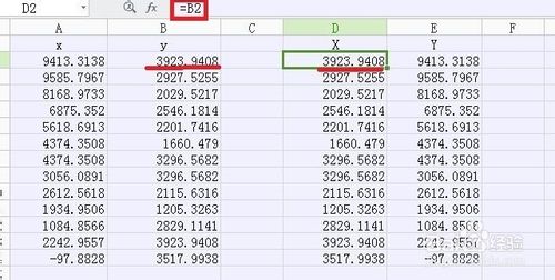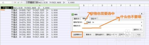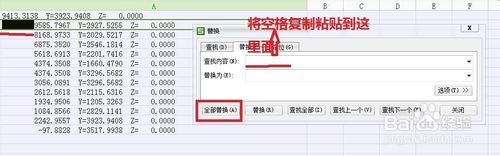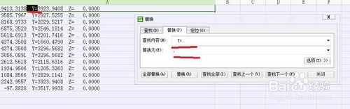 第三步:用Excel”替換“命令刪除不必要文字和空格。選中文本所在單元格。點擊”開始“右側的“替換”(或者”編輯“——”替換“)。選中第一格X坐標前的所有部分。復制粘貼到”查找內容“中。“替換為”什么也不用填。點選“全部替換(A)”。發現此時格式還是有些別扭。所以還要再進行幾步上述操作,將如第二行一樣格式文本中多余的空格刪掉。