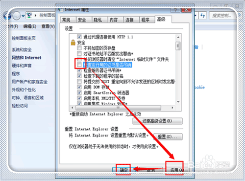 去掉“檢查發(fā)行商的證書是否吊銷”前面的√,點(diǎn)擊“應(yīng)用”,點(diǎn)擊“確定”。