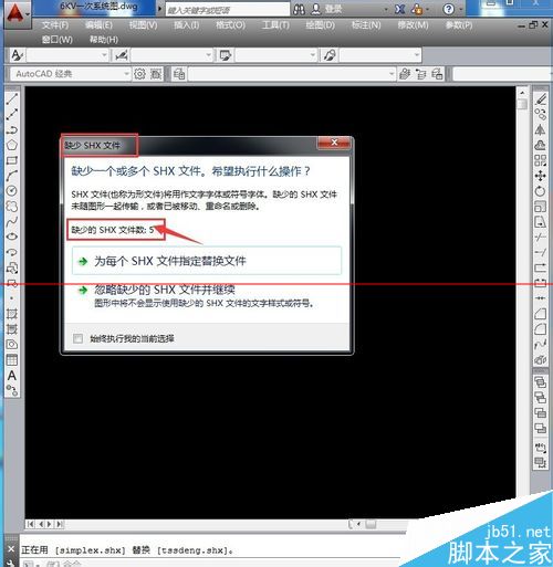 1、在打開時顯示缺少SHX文件,系統提示下一步怎么操作,是為每個SHX文件指定替換文件,還是忽略缺少的SHX文件并繼續
