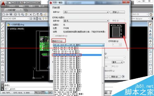 6、圖紙尺寸,這個根據打印機的要求,我的打印機只能打A4的,所以只能選擇A4的紙張尺寸,右側有預覽,有豎向的和橫向的,看圖紙適合的要求。