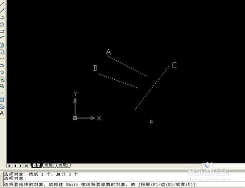 6、鼠標左鍵分別點擊線段A、B,線段A、B分別延伸至線段C上,如下圖: