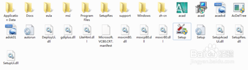 1、AutoCAD 2008安裝包 如果是壓縮包或鏡像文件的話先解壓,如果是光盤先把文件都復制到本地硬盤,得到AutoCAD 2008安裝包文件夾下的文件如圖:
