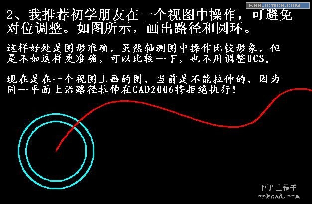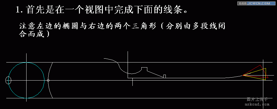 有朋友會問,為什么不在主視圖畫好后,切換到俯視圖中去操作呢。這種操作我也常用的,只是對于這樣的例子我一般不切換視圖,雖然切換視圖有其優點,但切換后統統重疊成一條線,要尋找自己想要那條線,不容易找到!結果轉來轉去,又到軸測圖中進行了。