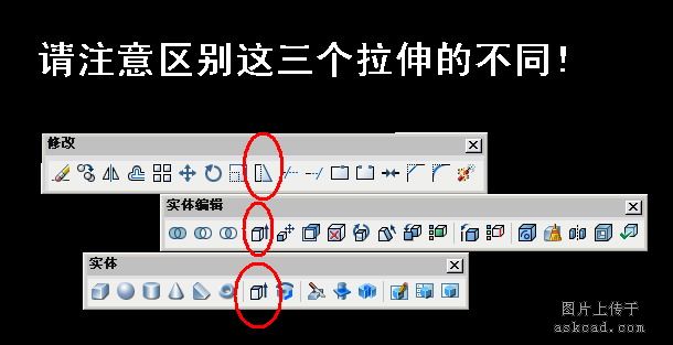 小議:如果僅僅從這個例子是看不出實體拉伸有多大的優勢的,但切記這是三維畫圖兩個元帥之一,需要注意事項是,"拉伸命令"在auto cad中有三個地方出現,切記不能混淆!!第一個就是平面上的"拉伸",相信大家都用過了。第二個就是"實體"拉伸,它在實體工具欄上,我說的一般指這個。第三個是"實體編輯"上有個"拉伸面",這個是修改時用到的,剛開始涉及不到。尤其是后面兩個最容易弄混,弄混的結果是發現系統不執行這個命令。