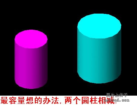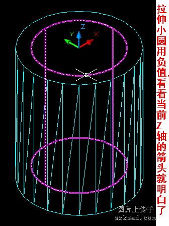 4、先伸好了大圓柱后,利用ucs移動坐標,把大圓柱的頂面作為x-y平面,然后在圓柱頂面捕捉圓心點作為小圓的圓心,畫好小圓后拉伸成小圓柱(拉伸這時要取負數!回頭看看上面的講解,注意看當前坐標軸就會明白為什么么了,就這么簡單。)
