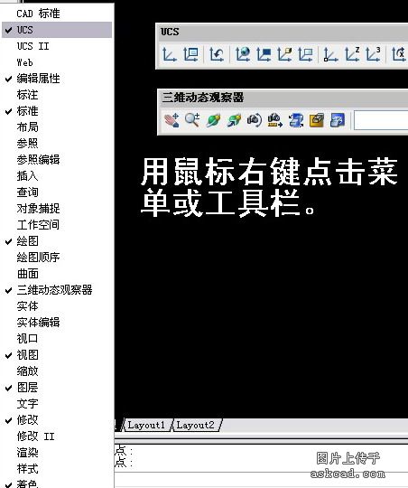 (2)我說一下我的給圖習慣[cad2006],我通常是把系統屏幕上默認的工具欄小調一下,關掉"層次"工具欄和文字樣式工具欄,用于放"視圖"工具欄和"著色"工具欄。把"ucs"和"三維觀察器"打開放到屏幕下側。這樣來,屏幕盡量更開闊些,對于象"實體"欄,我很少用到。實體工具欄上的主要東西,用命令來完成。基本上,設置就是這樣,我推薦初學朋友用命令(就是對應畫圖與編輯工具上的那些)與部分圖標(如視圖、ucs)結合使用的方式。很快就可以上手了。