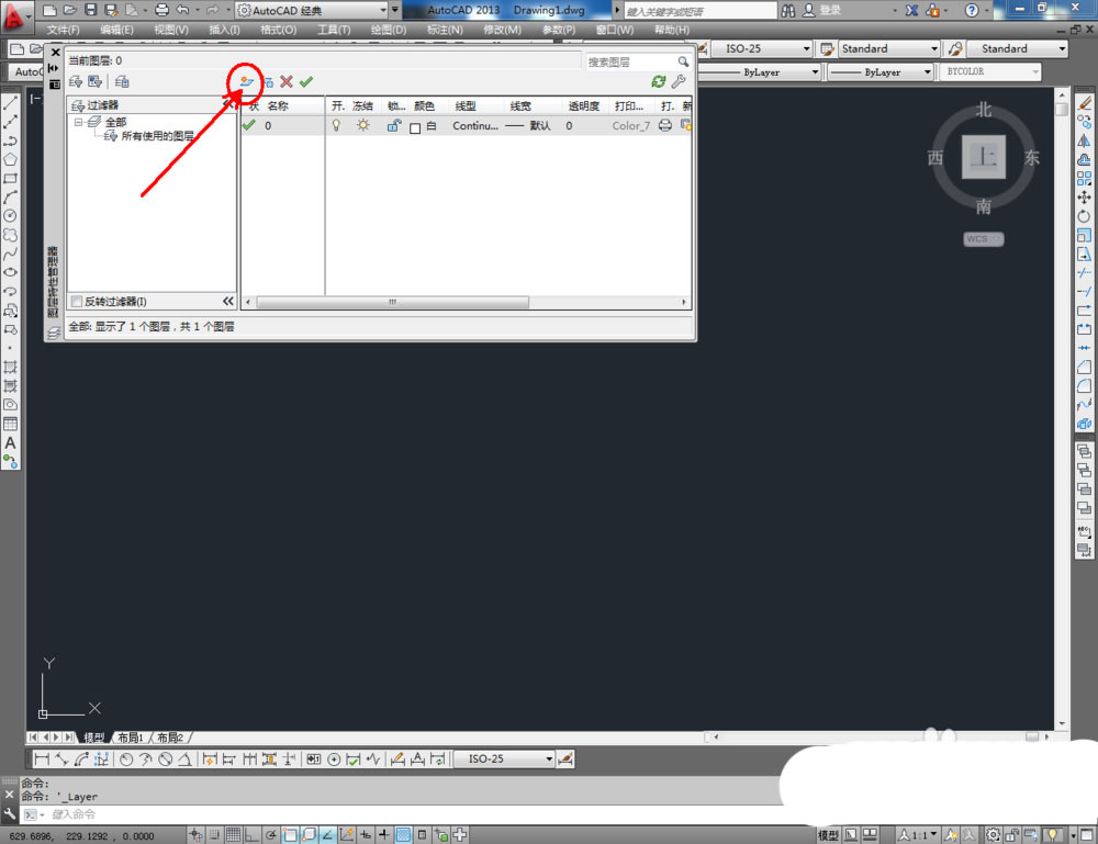 1、打開AutoCAD 2013軟件,點擊【圖層特性管理器】,點擊【新建圖層】,將圖層命名為:四門鞋柜。點擊色塊,按圖示設置一個圖層顏色,完成四門鞋柜圖層的設置(如圖所示);