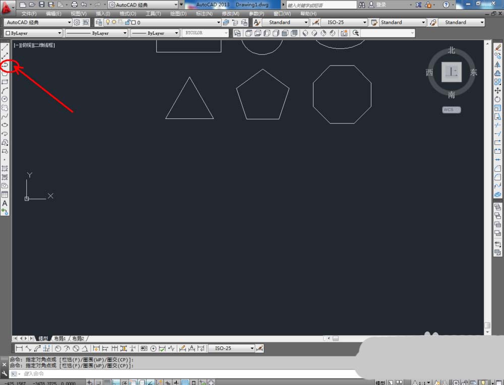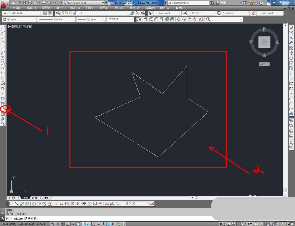 5、點擊【直線工具】,在作圖區域繪制出幾個圖案(如圖所示)。點擊左邊工具欄【面域】命令后,框選繪制好的兩個圖案,并按下空格鍵。可以看到,經過【面域】后的區域也能創建為二維閉合區域。