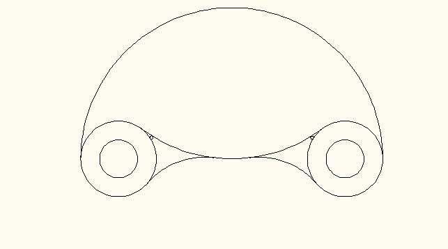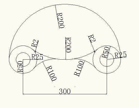 4、然后同樣用相切相切畫圓,半徑100,相切點為左邊圓下半部分和半徑200的圓弧點上,并鏡像修剪后可得