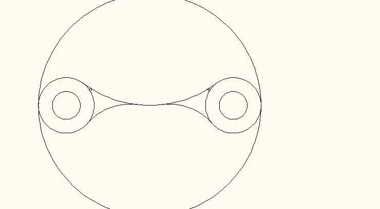 5、在左邊圓弧里面畫相切相切半徑2的圓并鏡像,然后用兩點畫圓,兩點分別為最左邊的圓的端點和最右邊圓的端點,如圖所示。