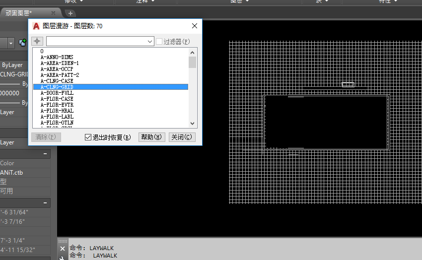 1、先看一下[laywalk]命令,此命令非常方便有用,特別是您單位或者您的客戶對圖層的要求比較嚴格和規范的情況下。使用前最好調整所需視圖,如果需要全圖檢查圖層的情況,最好把視圖放縮到最大: zoom e.