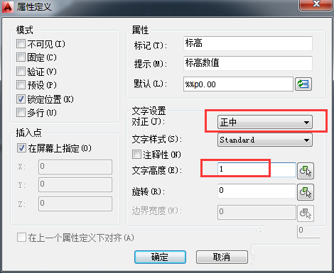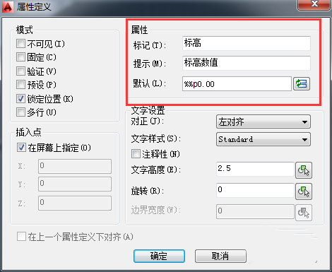 3、在【屬性】選項組中【標記】文本框中輸入【標高】,然后在【提示】文本框中輸入【標高數值】,并在【默認】文本框中輸入“%%p0.00”。