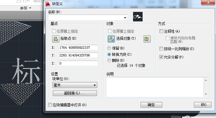 8、在【塊定義】對話框中,單擊【確定】完成創建。