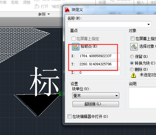 6、選擇【創建塊】選項,在打開的【塊定義】對話框中單擊【拾取點】按鈕,指定標高圖塊的基點。