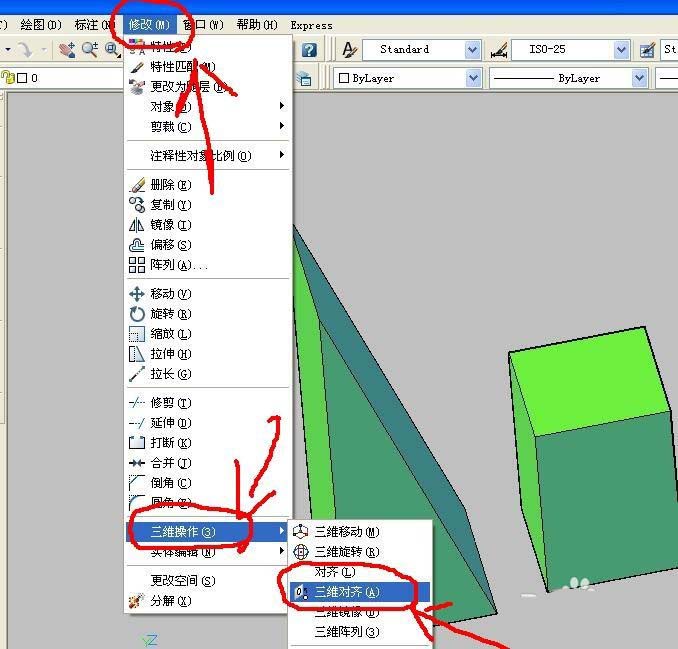 2、選擇修改--三維操作--三維對齊功能選項,鼠標左鍵點開。