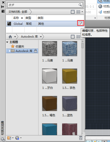 1、首先單擊【材質瀏覽器】按鈕,在打開的選項板中,選中所要修改的材質,單擊右側編輯按鈕,如圖所示。