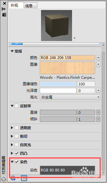 6、勾選【染色】復選框,并單擊【染色】選項,打開【選擇顏色】對話框,調整好著色顏色,單擊【確定】按鈕即可完成材質著色的設置,結果所示。