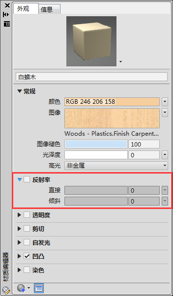 5、然后在【材質編輯器】選項板的【反射率】選項組中,調整【反射率】的參數,此時在材質瀏覽圖中即可查看調整結果。