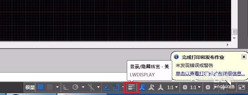 3、線寬雖然調整了,但是顯示仍然為細線。這時候我們可以通過“顯示線寬”開關來將線型寬度顯示出來。