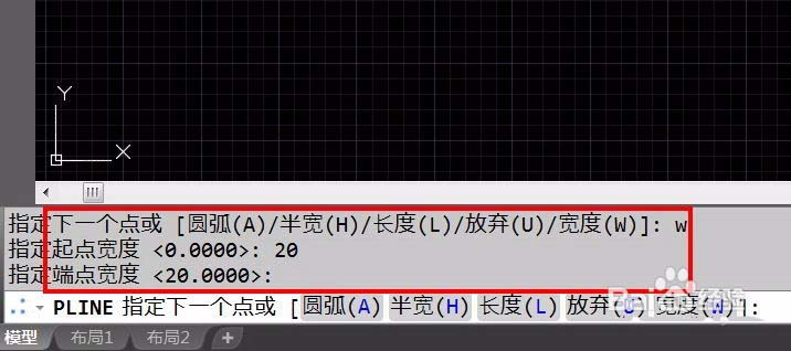 2、通過參數W來設置寬度,前面我們的例子出圖比例為1:10,計劃打印寬度為2mm,因此繪制的線寬應為20mm。
