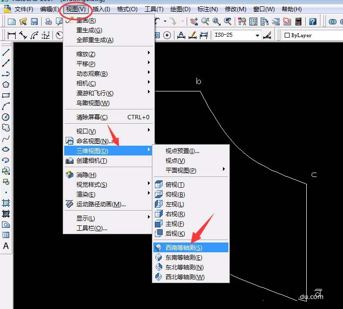 2、單擊“視圖”菜單中“三維視圖”中“西南等軸測”,單擊“工具”菜單中“新建UCS”中單擊X軸,已默認X軸方向旋轉90°按空格鍵確定。