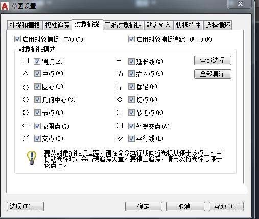 4、設置捕捉模式如圖打開,然后設置你需要的捕捉如圖: