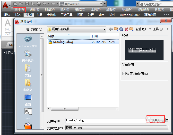 2、通過菜單欄的【文件】》【打開】方式,載入有數據表格的cad文件。